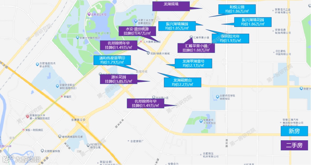 2023年泛经开片区主要成交项目和悦云锦、振兴湖境臻园、通和伟星翡翠印以及和悦云庭,近两年泛经开新房市场较为火热,尤其板块内延金寨路F4项目,到后来F6项目,当时可谓一房难求。二手房方面,大部分挂牌价在1.5万/㎡ 左右,个别次新房挂牌价在1.8万/㎡左右,整体来看与新房不存在倒挂现象,而最新开盘的龙湖翠湖壹号以及龙湖砚熙台备案均价都已经超过2万/㎡。