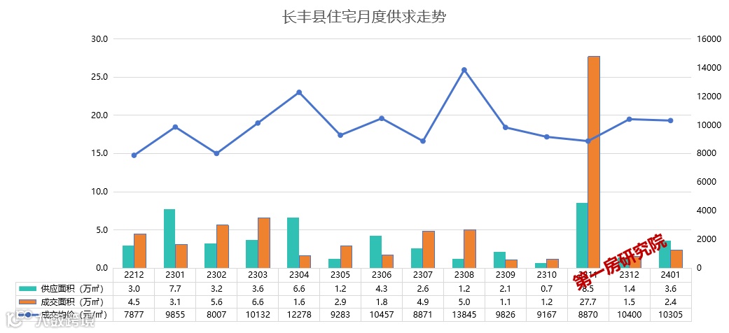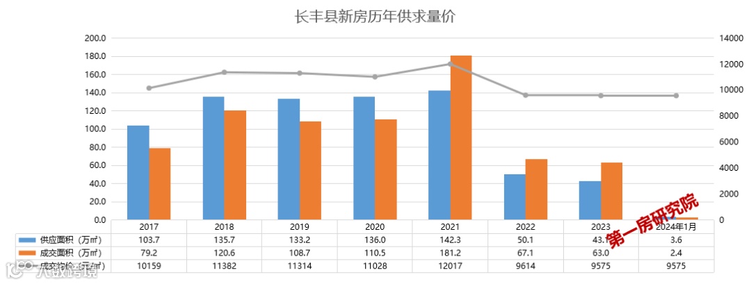 长丰县近6年新房成交走势先扬后抑,2022年受疫情和行业遇冷双重影响,成交量价下滑。去年,长丰新房与2022年相比较为稳定,新房供应面积41.7万㎡,成交面积63.0万㎡,成交均价9575元/㎡。