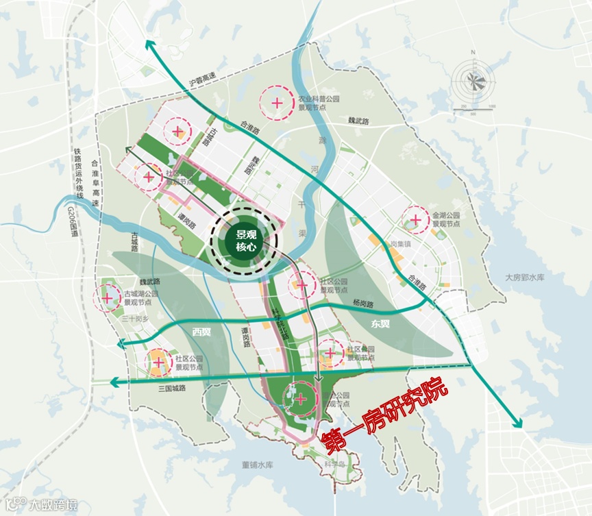 未来大科学城地处合肥西北象限,拥有“董铺水库+大房郢水库”双湖生态资源,生态敏感度高;域内受基本农田、生态红线、水源保护区等诸多限制,因此本次城市设计需要坚持生态优先的底线思维,通过科学合理谋划,探索紧约束条件下的空间布局。