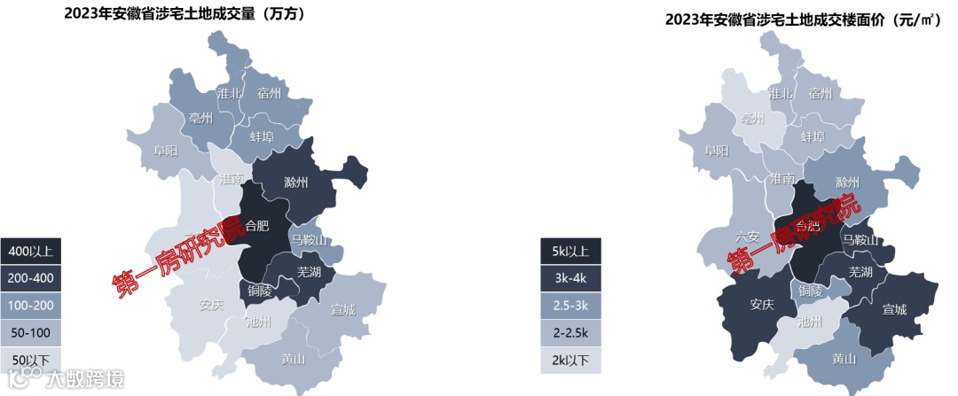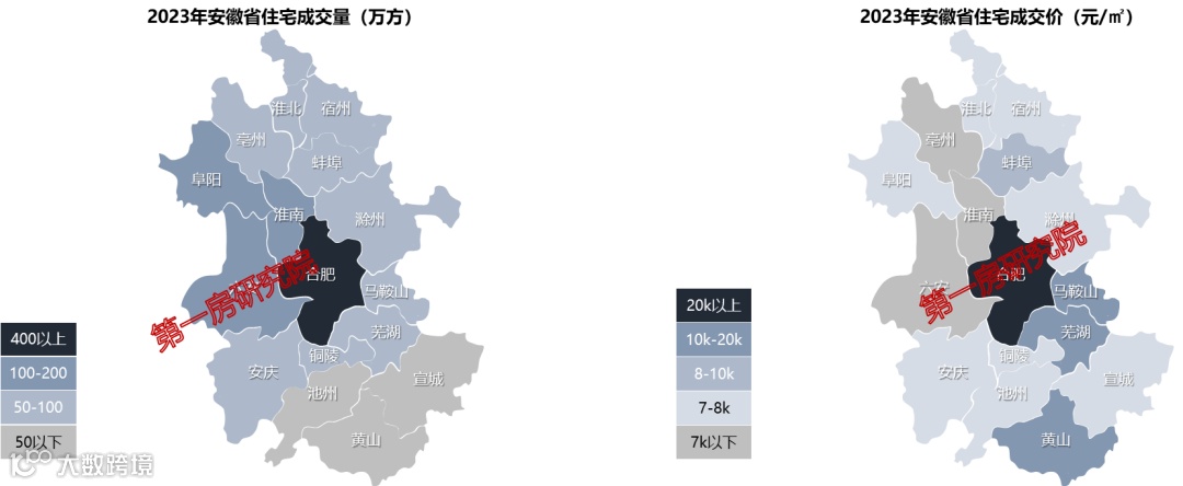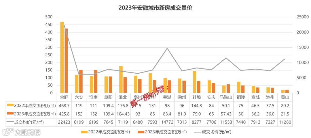 2023年合肥新房成交超400万方,六安、淮南、阜阳、淮北四城成交超百万,仅三城成交不足50万方。合肥房价超2万,马鞍山、芜湖、黄山房价超1万,一半城市房价在7K-8K之间。