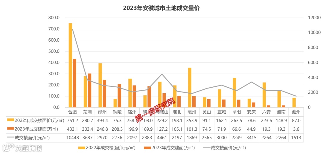 2023年土地成交量在400万方以上的只有合肥,而滁州、芜湖、铜陵三城成交200-400万方,蚌埠、马鞍山、宿州、亳州、淮北成交超100万方。合肥楼面价超1万元/㎡,马鞍山、芜湖、安庆、宣城四城超3000元/㎡,遥遥领先。