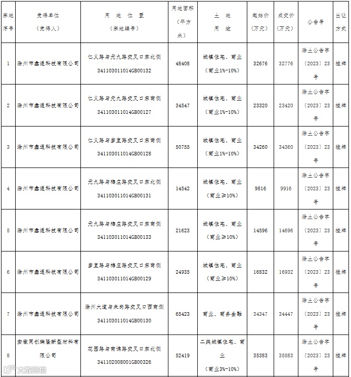 导读:2023年12月13日,滁州市自然资源和规划局在市公共资源交易中心公开挂牌出让14宗经营性用地,成交14宗。