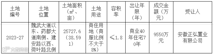 安徽正弘置业竞得亳州1宗涉宅用地,成交价9550万元