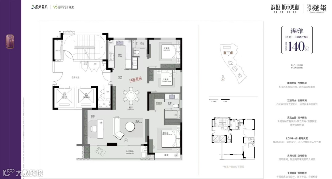 以140m²的为例来看,三房两厅两卫,首先很直观的,动静分离,卧室都在东边,但只有主卧室朝南的,儿童房朝东,老人房朝北。主卧配了卫生间和衣帽间,更加方便。