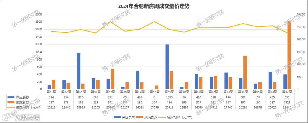 最近两三周合肥新房每周备案量都在200套以内,但是上周备案量暴涨。根据第一房研究院AI楼市指数系统统计数据显示,上周(11月18日-11月24日)合肥新房成交1828套房源,环比上涨了877.5%,成交均价22640元/㎡,环比下跌了约11%。