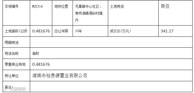 淮南市裕贵源置业拿下毛集实验区1宗商住地块,成交价341.17万元