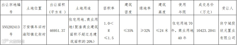 休宁城投状元置业竞得休宁县1宗涉宅用地,成交总价1.04亿元