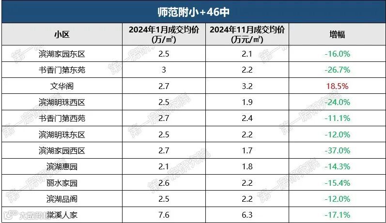 滨湖最好的学区是46中+师范附小本部。从统计的11个楼盘来看,除了棠溪人家以外,滨湖师范附小+46中的学区房最新成交价在2.3-3万/㎡左右。再来看下涨跌情况。仅1个小区几个上涨,10个小区出现了不同程度的价格下跌。下跌最多的是滨湖家园西区,下滑接近10000元/㎡。其次是书香门第东苑,下滑接近8000元/㎡。其他下跌的小区基本上跌幅都在2000-3000元/㎡不等。文华阁上涨近5000元/㎡。