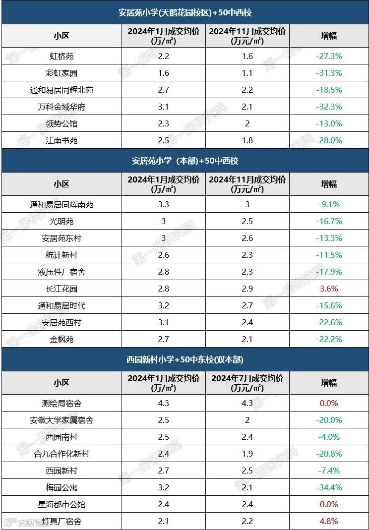 安居苑小学、西园新村小学、50中是蜀山区最具有代表的学区房, 从统计的23个小区结果来看,都出现了不同程度的跌幅。两个出现了涨幅,如长江花园涨了约10000元/㎡。2024年1-11月除了长江花园、灯具厂宿舍外所有小区基本上价格都有不同程度的下跌,最高跌幅,如梅园公寓跌了约11000/㎡。