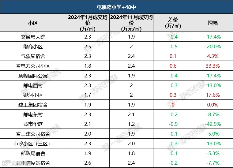 屯溪路小学+48中14个学区房可分为两大类,一类以交通局大院、气象局宿舍等为代表的老破小;另一类则房龄相对较新,如顶峰国际公寓、邮电西村、城市华庭等为代表。从统计的结果来看,大部分的小区房价都在下跌,最高的跌幅,如城市华庭,1-11月房价跌了约9000元/㎡。省电力公司小区、气象局宿舍、银河小区等3个小区出现了上涨。