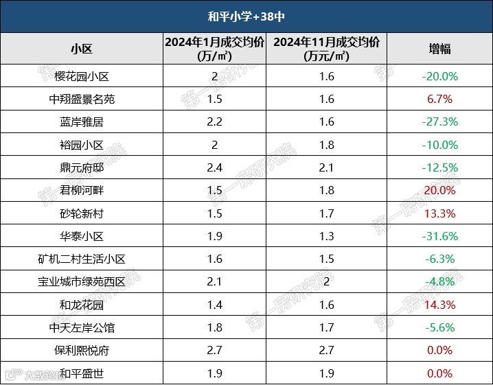 和平小学+38中是瑶海最好的学区组合, 从统计的14个小区结果来看,整体跌多涨少,成交价上涨的小区如中翔盛景名苑、君柳河畔、砂轮新村、和龙花园,涨幅在1000-3000元/㎡左右;保利熙悦府、和平盛世这两个小区1-11月成交价持平;其他8个小区均有不同程度的下跌,跌幅最大如华泰小区,1-11月跌了约6000元/㎡。
