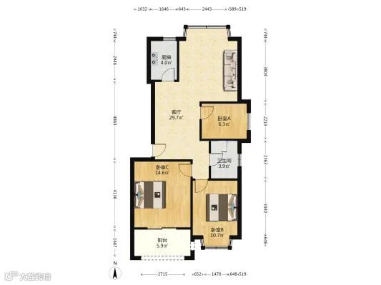 户型双开间朝南,2个卧室朝南,84.89㎡做了3房,整个户型布局上,动静分区,北边带一个生活阳台,卫生间都是明卫。