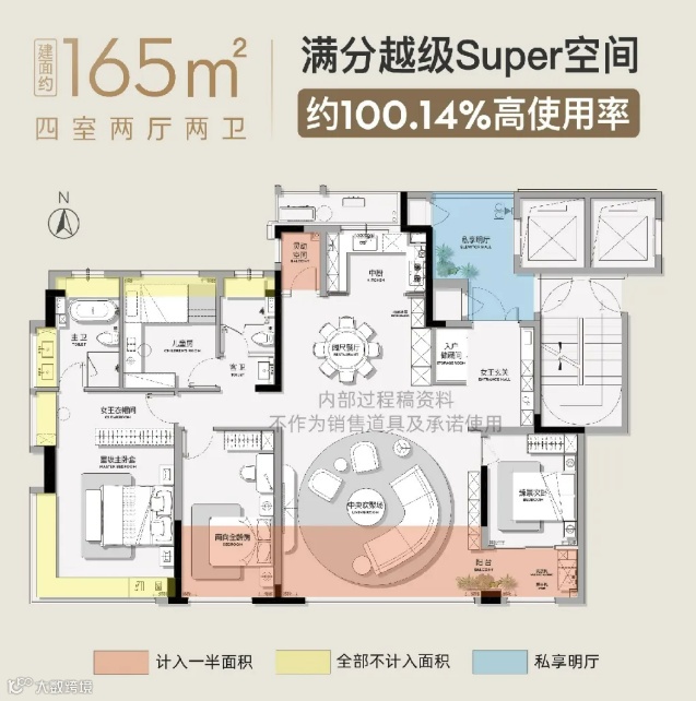 其中天阜壹号在新规计容的设计上,不计算私享梯明厅的面积,建筑面积约143㎡的户型,使用率可达约97.79%,165㎡户型的使用率突破了100%。