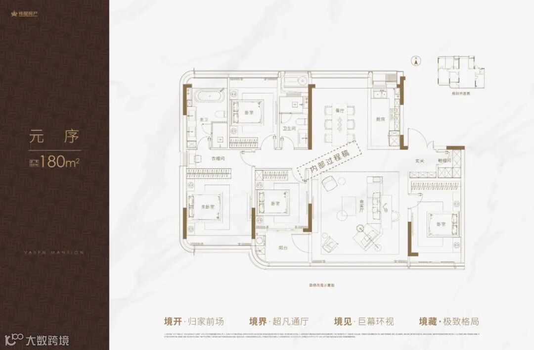 伟星天元最小就是180㎡的户型,该户型为四室两厅两卫设计,空间利用率较高。玄关处配置独立衣帽间,提升储物功能。客厅配置大落地窗,视野开阔;居住区位于西侧,实现会客区与休息区的明确划分,动静分离。