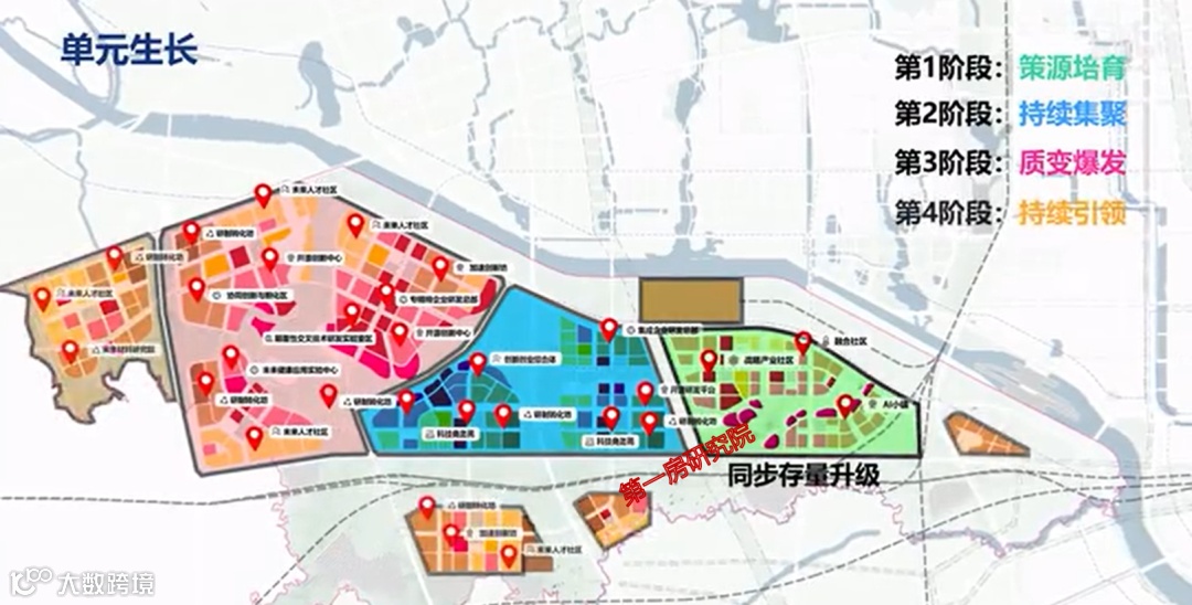 开发节奏方面,制定4阶生长计划,一阶段,开发片区东侧,在未来产业大规模商用前侧重策源培育,把控开发节奏;二阶段,开发片区中部,侧重持续集聚,不断导入新的未来产业;三阶段,开发片区中西侧,实现质变爆发,全面引领;四阶段,开发片区外围,持续引领,同步升级存量。