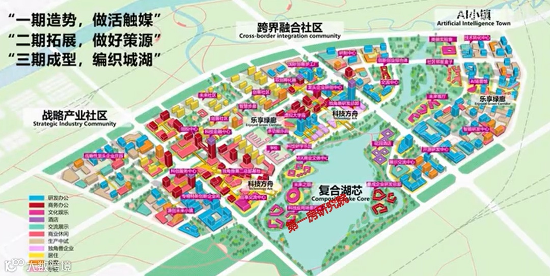 该片区构建以人工智能为核心,多元产业跨界融合的未来产业体系,一期造势,启动AI小镇,布局一批应用场景和共性研发平台,驱动招商,做活触媒;二期拓展,建设跨界混台社区,面向多元产业引爆,以成熟集成企业和场景营造,做好策源;三期成型,打造战略产业社区,集聚一批高势能企业与创新