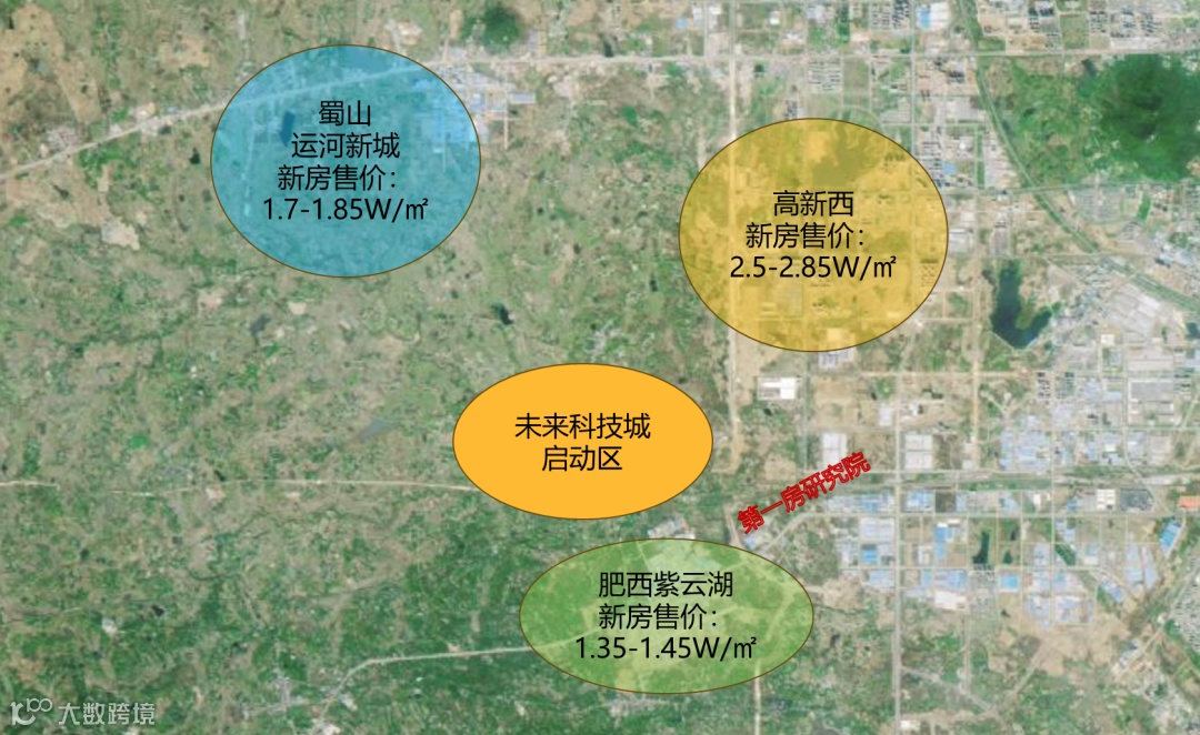 该片区暂无新房在售,周边临近的有三个板块,蜀山运河新城板块售价在1.7-1.85W元/㎡,高新西板块的价格则最高,在2.5-3W元/㎡,而南侧的肥西紫云湖板块的均价则在1.35-1.45W元/㎡,未来科技城还处于开发初期阶段。