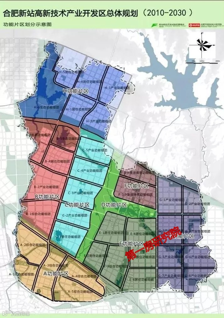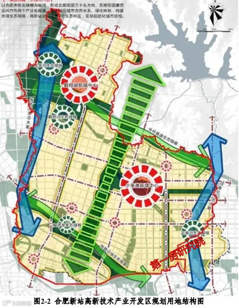 根据合肥新站高新技术产业开发区总体规划(2010-2030年)可知,鹤翔湖片区被划分在B功能片区,位于淮南铁路线以北、合六叶高速公路以南、新蚌埠路以西,规划用地面积约 26.2平方公里。重点发展职能为低碳工业、综合商贸、科技研发、生态居住。而少荃湖板块则位于F功能片区,位于合六叶高速公路以南、桥头集路以西、东方大道以北、前岭路以东,规划用地面积约 18.5 平方公里。重点发展职能为行政中心、商业中心、综合服务中心、生态居住。相对而言,更偏重生活属性。