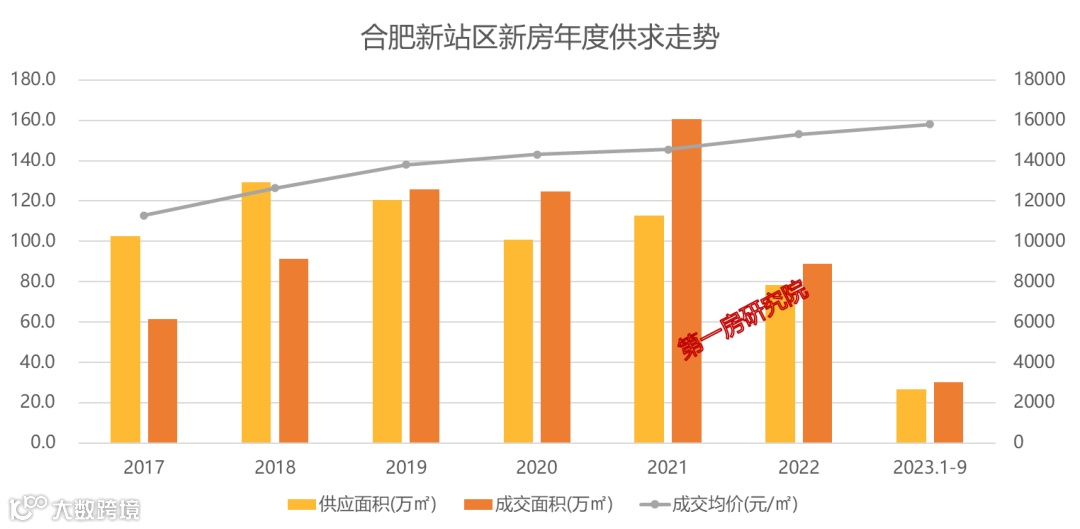 合肥市新站区新房市场年均供应107.3万㎡,年均成交108.8万㎡,供不应求,今年1-9月,新站区供应26.7万㎡,成交30.2万㎡,市场处于去库存状态,成交均价15794元/㎡,整体处于上行趋势。