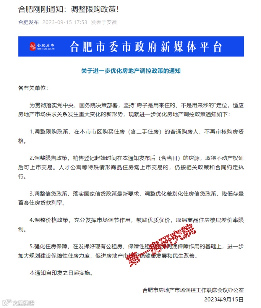 9月15日消息,合肥调整限购、限售政策。合肥市房地产市场调控工作联席会议办公室发布《关于进一步优化房地产调控政策的通知》,自印发之日起实施。主要有五点内容:一是调整限购政策;二是调整限售政策;三是调整信贷政策;四是调整价格政策;五是强化住房保障。