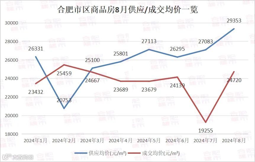 根据第一房研究院AI楼市指数系统数据,8月份,合肥市区新房成交均价24720元/㎡,环比上涨5465元/㎡,这也是今年2月份之后,新房成交均价的最高点。