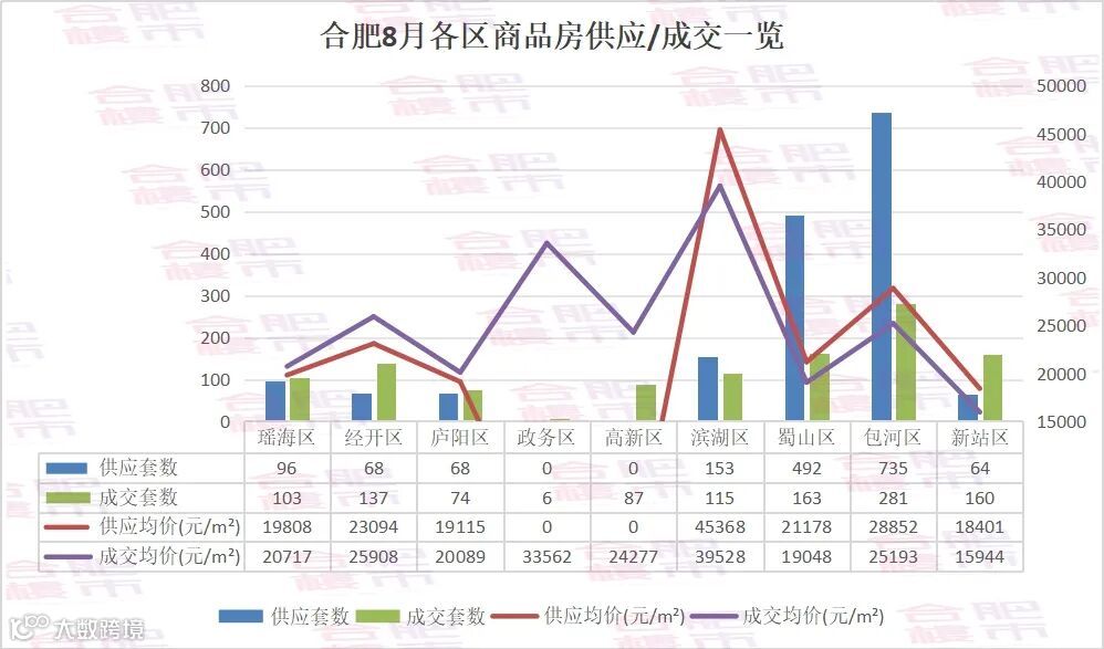 但从供求量来看,蜀山、包河为8月供应大头,占据总量的70%;成交上,包河、新站为主力,一个是合肥新房扎堆分布的区域,另一个则是刚需置业的价格洼地。