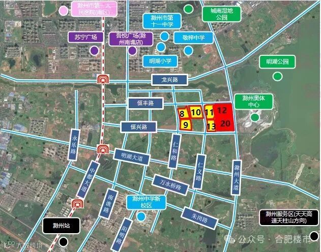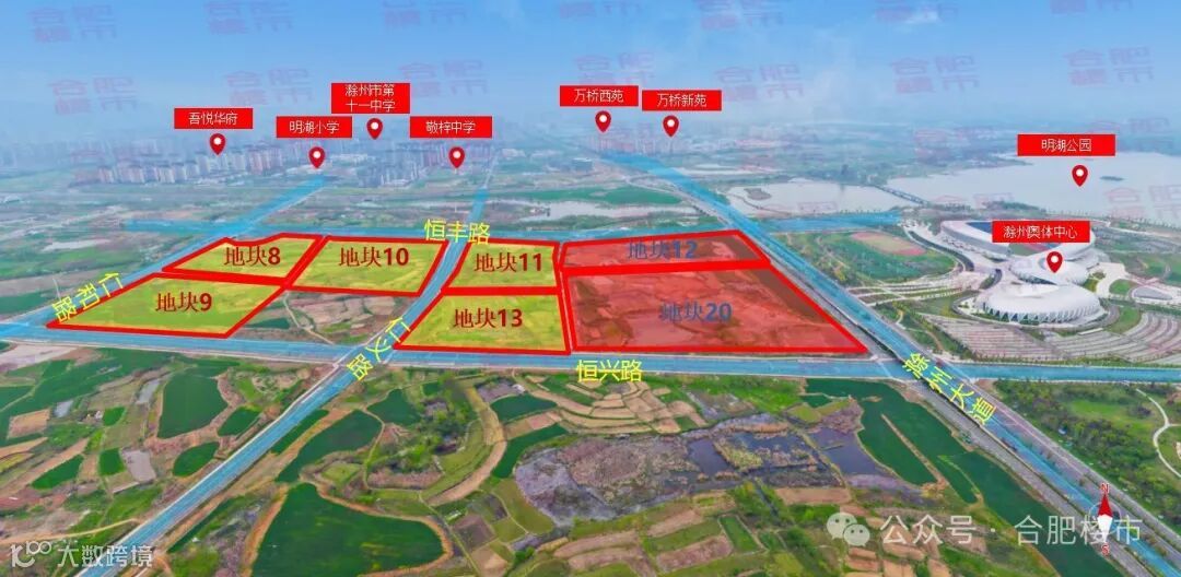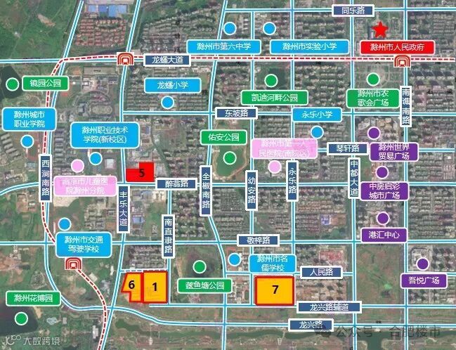 该7宗地位于明湖板块,地块周边交通便捷,距离滁州站和滁州服务区都不足4km,教育资源有敬梓中学、明湖小学、滁州中学新校区等,地块东侧是滁州奥体中心和明湖,环境优美,商业配套有苏宁广场、吾悦广场(滁州南谯店),地块未来潜力大。