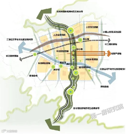 尊重运河新城周边的生态本底条件,结合天然水系、生态绿廊,打造一座座与自然相融的功能复合、灵动多元的微镇。