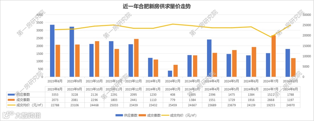 先来看下合肥新房整体市场情况,8月份合肥新房成交1197套房源,环比下跌55.1%,同比下跌42.2%,成交均价24970元/㎡,环比上涨29.7%,同比上涨了9.6%。整体来看合肥新房成交腰斩,成交价格不断攀升。
