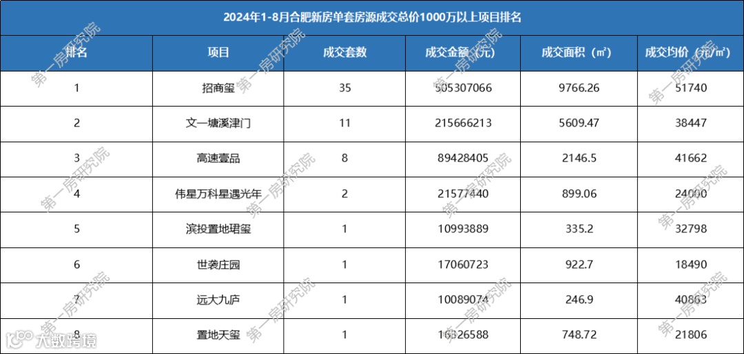 首先来看下千万级以上顶级高端住宅榜单。根据第一房研究院AI楼市指数系统统计数据显示,2024年1-8月份合肥单套房源总价超1000万千以上的总共成交了60套房源,分布在8个项目。其中招商玺成交35套房源,占比58.3%,将近6成,其次是文一塘溪津门成交11套房源,均是别墅房源,另外高速壹品上半年成交千万级以上房源8套。高新区伟星万科星遇光年成交2套千万级洋房,滨湖置地珺玺、世袭庄园、远大九庐和置地天玺各成交一套。