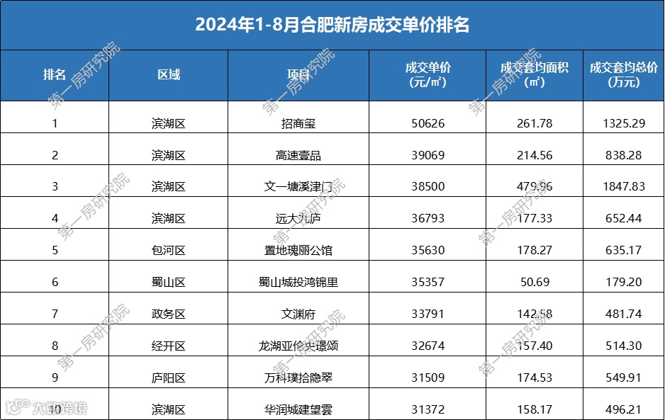 从今年2024年1-8月项目成交均价榜单来看,招商玺均价超过5万/㎡排名第一,高速壹品3.9万/㎡ 排名第二,文一塘溪津门成交3.85万排名第三,前十成交均价都破3万/㎡。