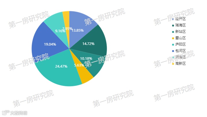 分区域来看,庐阳区成交面积占比24.47%,九区排名第一。包河区成交面积占比19.04%,九区排名第二。瑶海区成交面积占比14.72%,九区排名第三。