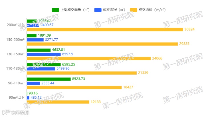 从成交面积段来看,本周成交面积段130-150m²的占比最大。