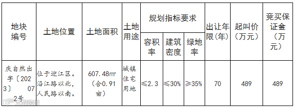 根据《中华人民共和国土地管理法》《中华人民共和国城市房地产管理法》《招标拍卖挂牌出让国有建设用地使用权规定》(原国土资源部39号令)等法律、法规的规定,经批准,出让庆自然出字〔2023〕072号地块的国有建设用地使用权。现将有关事项公告如下: