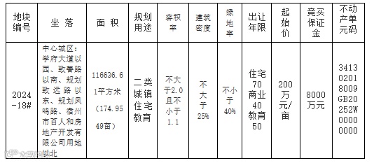 2024-18#地块要求:1、竞买人须为公司法人。2、竞得人须自成交之日起10个工作日内签订项目地块《国有建设用地使用权出让合同》,因竞得人自身原因,逾期未签订的终止供地,竞买保证金不予返还。竞得人注册所在地位于宿州市境外的(属宿州市境内企业,如需在项目所在地辖区内另行注册全资子公司的,须在报名时作出书面申请),须自成交之日起40日内在项目所在地设立一个有法人资格的全资子公司并由其与市自然资源和规划局签订《国有建设用地使用权出让合同变更协议》,竞得人及其全资子公司对宗地出让文件、《国有建设用地使用权出让合同》及《国有建设用地使用权出让合同变更协议》的权利、义务互负连带责任。3、竞买人在办理竞买登记手续时,须书面承诺“已认真阅读该宗地相关出让文件并自愿受其约束,对土地现状充分了解无异议,愿意在约定时间内现状接受土地,签订《国有建设用地交付确认表》,不对宗地现状交付和相关出让文件有异议或提出抗辩”。4、竞买人竞得土地后,须按规划条件通知书、《宿州市控制性详细规划通则》和出让合同约定的容积率进行开发建设,不得擅自改变,未经批准,擅自提高容积率的,超容积率部分无偿收回或按规定补缴土地出让金并作处罚。5、竞得人可以选择分期付款方式支付土地出让金,竞买保证金直接转为首期土地出让金且首期(合同签订之日起1个月内)缴纳比例不低于总价款的50%,1年内缴清全部出让价款。分期支付出让价款的,竞得人在支付第二期及以后各期出让价款时,须按照支付第一期土地出让价款之日中国人民银行公布的