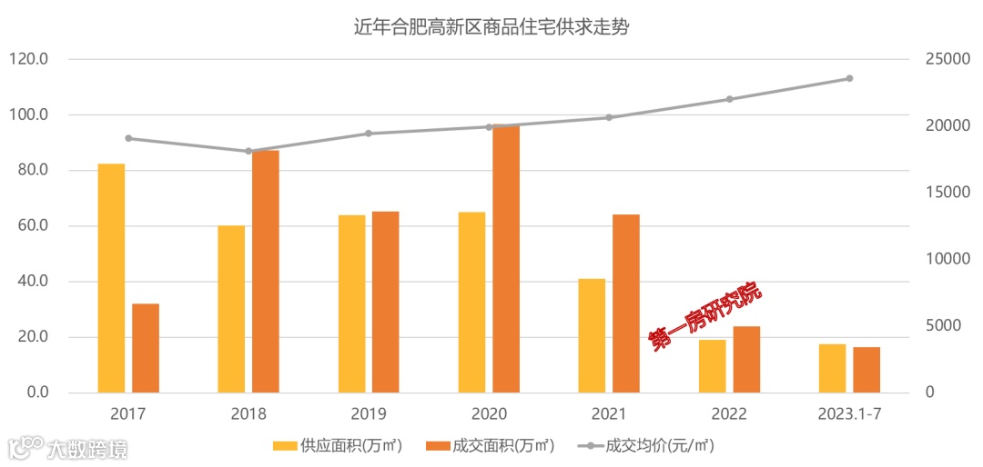 近六年,高新区商品住宅年均供应55.3万㎡,年均成交61.5万㎡,供不应求。今年1-7月,高新区累计供应17.6万㎡,成交16.5万㎡,成交均价达到了23561元/㎡。