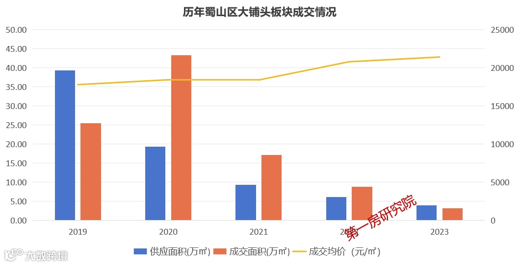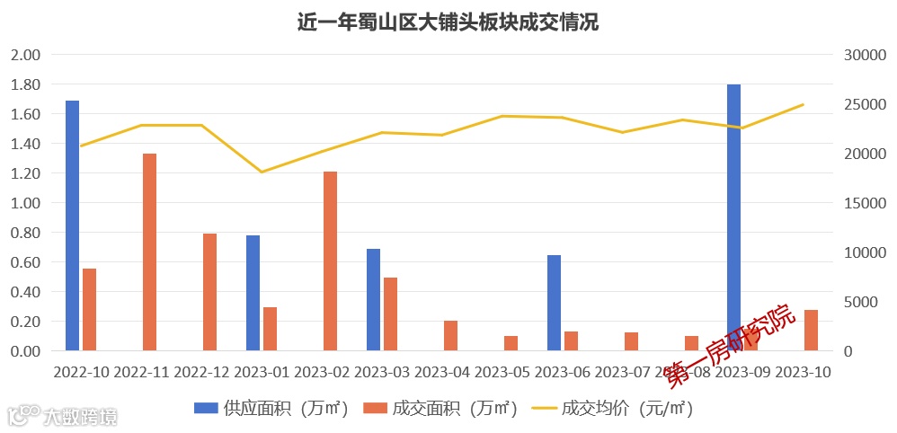 近4年蜀山区大铺头板块新房市场年均供应18.5万㎡,年均成交23.6万㎡,多处于供不应求的态势,成交均价也在稳步攀升。今年1-10月份累计供应3.9万㎡,成交3.1万㎡,几近平衡,均价21398元/㎡。