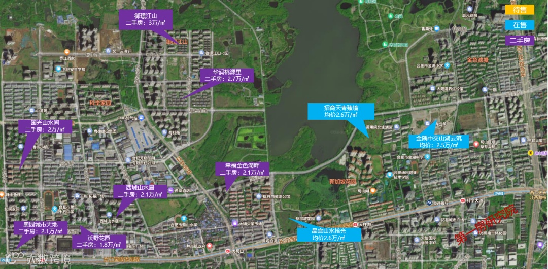 目前蜀山区大铺头板块内项目较少,在售项目3个,均价约2.6万/㎡,分别为晶宫山水拾光精装高层均价26194.88元/㎡,招商天青臻境小高层均价26000元/㎡,低密多层均价33000元/㎡,金隅中交山湖云筑销售均价2.5万元/㎡,目前剩余少量房源。其中晶宫山水拾光和招商天青臻境两个项目是满分竞品质项目。二手房方面,房龄较久的老小区不存在倒挂现象,但部分房龄较短的品牌房企项目,挂牌价格甚至达3万/㎡,如御景江山等会出现倒挂现象。整体二手房挂牌价格在2-2.7万/㎡。