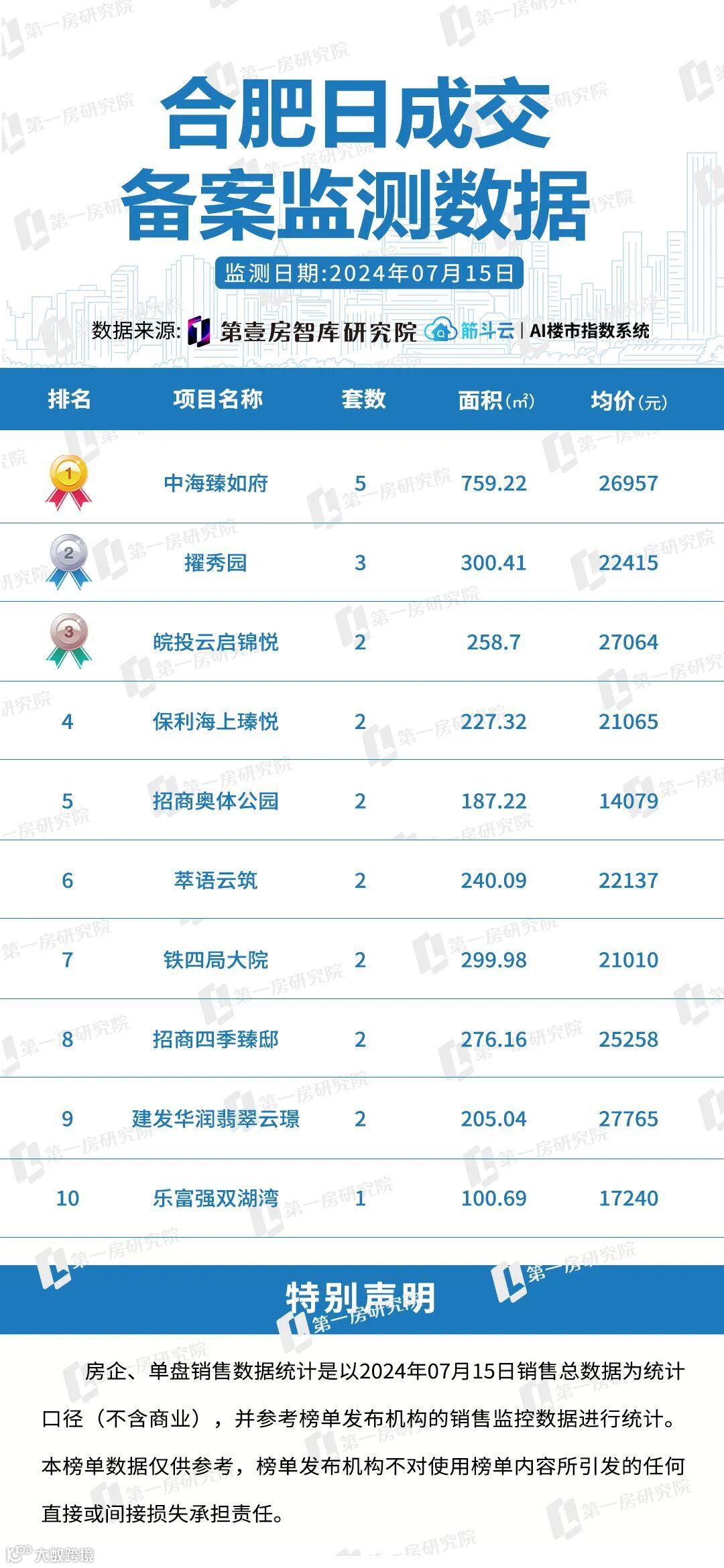 导读:7月15日合肥市区备案住宅类商品房44套,备案均价24177元/㎡本日楼盘备案TOP10:第一名,中海臻如府备