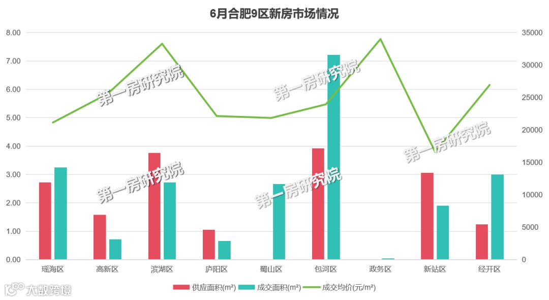 从新房成交来看,成交面积位于第一的是包河区,包河区6月成交7.22万方,占据合肥市区新房成交面积的1/3。九区整体供求来看,瑶海区、蜀山区、包河区、经开区的新房成交大于供应,市场情况处于向好的态势发展。