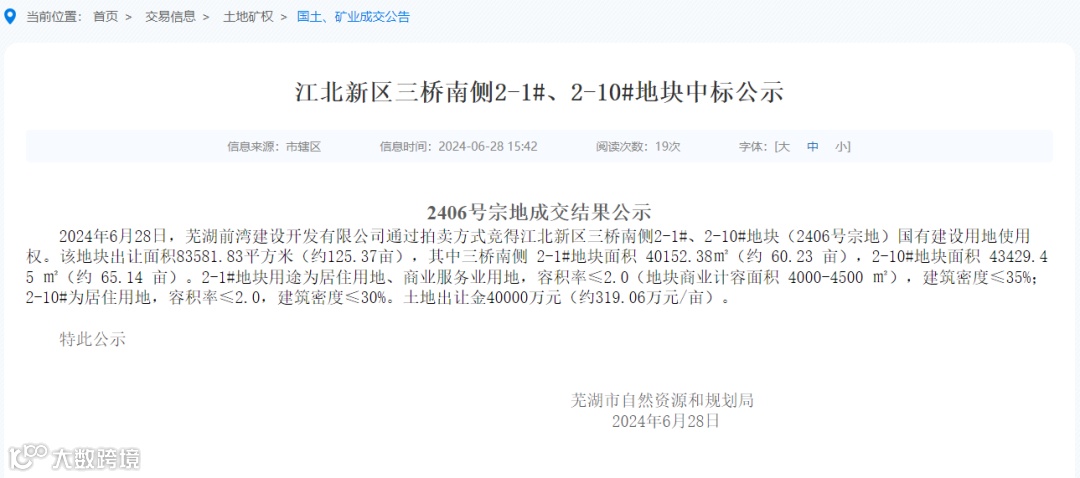 2024年6月28日,芜湖前湾建设开发有限公司通过拍卖方式竞得江北新区三桥南侧2-1#、2-10#地块(2406号宗地)国有建设用地使用权。该地块出让面积83581.83平方米(约125.37亩),其中三桥南侧 2-1#地块面积 40152.38㎡(约 60.23 亩),2-10#地块面积 43429.45 ㎡(约 65.14 亩)。2-1#地块用途为居住用地、商业服务业用地,容积率≤2.0(地块商业计容面积 4000-4500 ㎡),建筑密度≤35%;2-10#为居住用地,容积率≤2.0,建筑密度≤30%。土地出让金40000万元(约319.06万元/亩)。