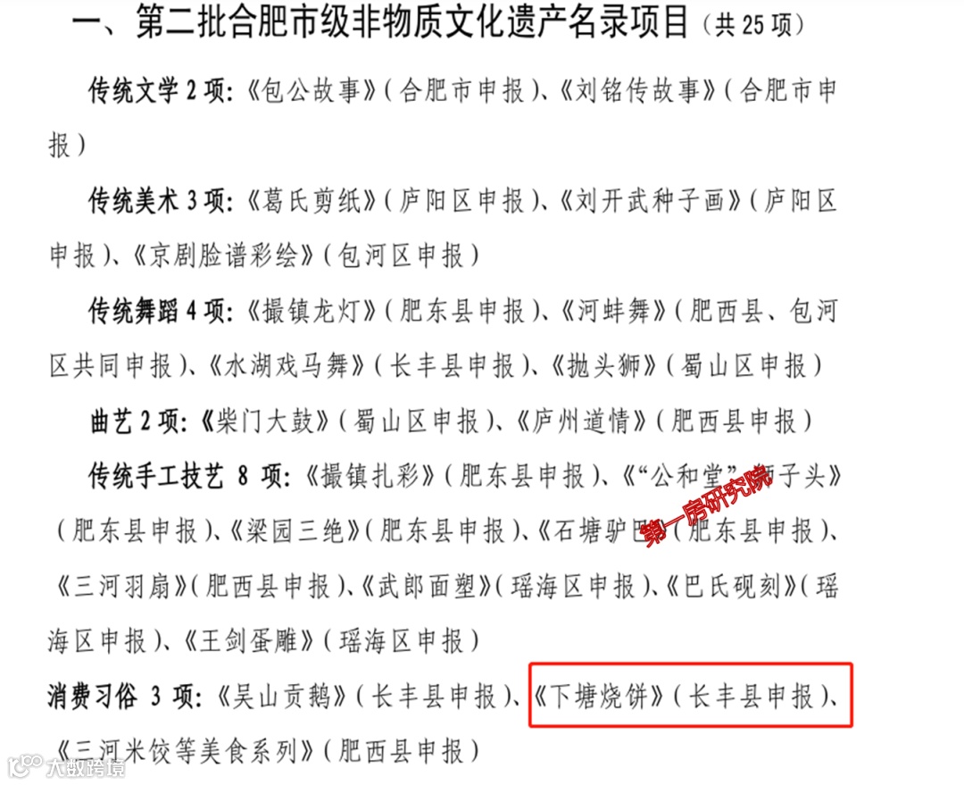 联想到的是“下塘烧饼”,这是下塘镇的传统名吃,起源于汉代,扬名于晚清,目前已为合肥市市级非物质文化遗产。经过多年发展,在2010年第二批入选合肥市非物质文化遗产名录,2014年成功申报国家地理标志