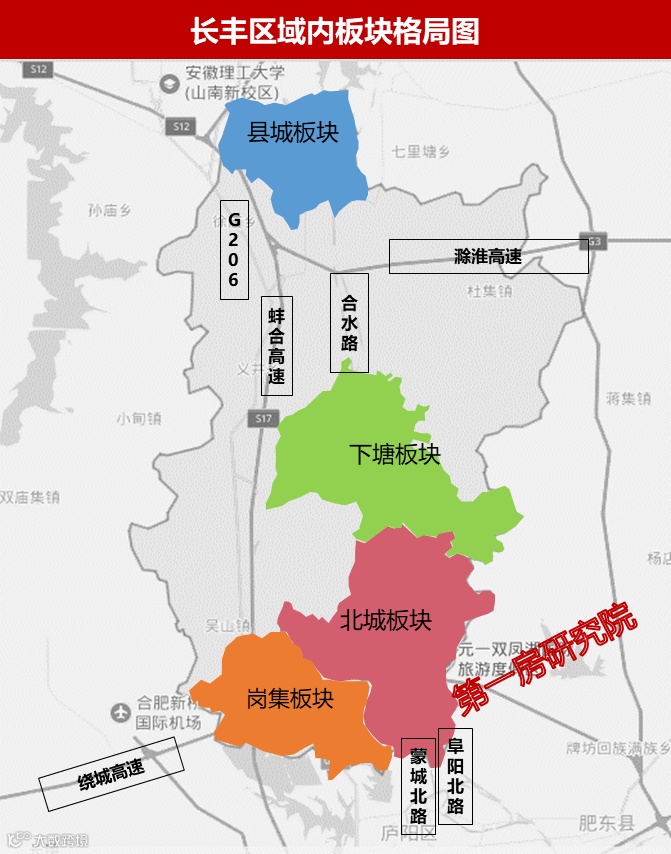 长丰县整体市场可按照区域特征分成四大板块,北城板块、岗集板块、下塘板块以及县城板块。