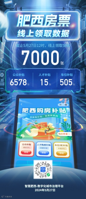 肥西的房票政策也是很多购房者关心的重点,截止5月27日12时,政策上线三日,通过肥西数字化城市治理平台——智慧肥西申领补贴房票超7000张!