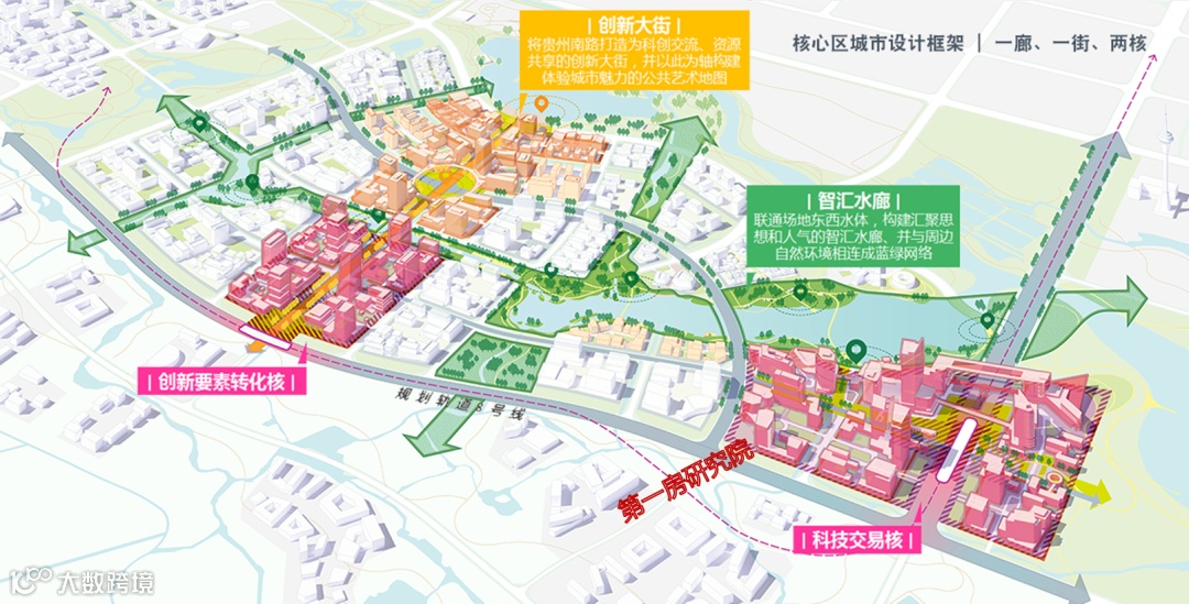 该片区总体规划以三生融合、宜居宜业宜游为目标原则,构建一带多廊、一轴三区的空间结构,体现三大空间特色:生态新水乡、低碳科贸港、艺术圩田境。