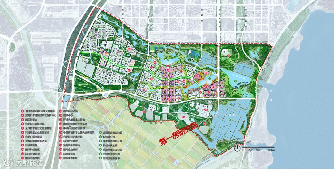 在这个范围内,规划显示:不仅包含了合肥科技转移学院、国际双语学校、合肥科技艺术学院,还包含合肥广播电视塔、全球技术商业化应用基地、科技明星企业总部基地、滨湖科学城峰会酒店、水岸科技酒店、科技智慧水岸、科技使馆群、国际科创社区、绿色生态社区、独角兽总部基地等等。另外,还包含:北涝圩庆典湖公园、科博湖公园、生态廊道郊野公园、科创市民公园、九联圩湿地公园等等。