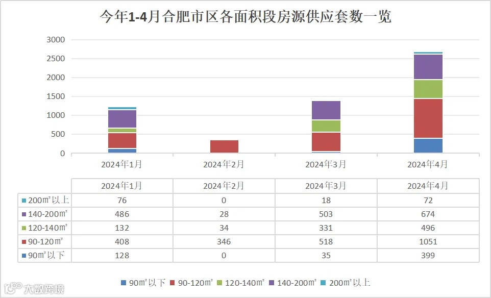 第一房研究院AI楼市指数系统的数据显示,今年1到4月份,合肥市区共计有5735套房源供应,140㎡以上户型为1857套,占比超过30%。