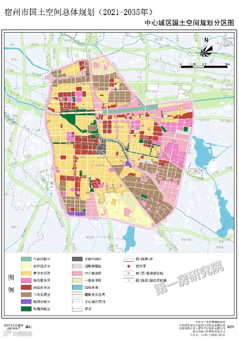 围绕市级行政中心、宿州古城及其周边文化、商业中心形成城市综合服务中心,依托城市主要交通线路和河流水系形成重要城市功能轴线和自然生态轴线,结合通风廊道、蓝绿廊道和城市功能明确城市组团分区,构建“一心、一廊、两轴、五组团”的城市空间结构。