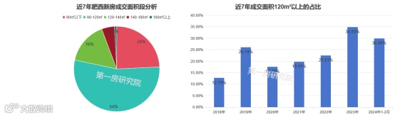 从成交面积段来看,近7年肥西新房成交面积90-120m²的占比最高,超过50%,是市场成交主力军。其次就是90m²以下的,占比24%。其中120m²以上的占比逐年攀升,市场吸引越来越多的改善型客户。