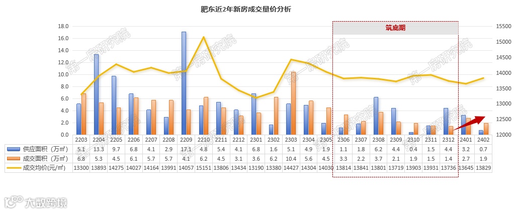 根据第一房研究院AI楼市指数系统统计数据显示,近2年肥东新房月均供应量4.9万㎡,月均成交量4.3万㎡,成交均价为13971元/㎡。分月度看,2023年整体成交量低于2022年,成交均价近1年略有下滑,下降171元/㎡。1-2月,在房票等利好政策的推动下,市场长期筑底后企稳回升,微幅上扬,预示着未来趋势或将反转。